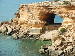 Abajo existe también una pequeña cueva donde antiguamente se refugiaban los canteros cuando llovía y que sirvió también de vivienda a algunos hippies, que empezaron a llamar a este lugar Atlantis, por la mágica influencia del islote de Es Vedrà y el extraño paisaje que compone la cantera.
