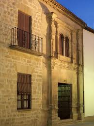 La portada principal es de arco de medio punto, con dovelas radiales y mensula en la clave, sobre jambas con imposta resaltada y enjutas con discos decorados; encima hay un entablamento que da paso a la primera planta, en la que se abre ventana de doble arco de medio punto y como parteluz tiene una columna toscana de marmol; sobre el la cruz de Calatrava, y ambos lados los escudos de los Acuna y Leon.