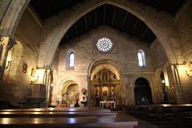 Edificio románico de la "zona vieja" de la ciudad, realizado en mampostería (1217), que contaba con tres naves, hoy con una sola dividida en cuatro tramos por medio de arcos ojivales que descansan sobre tres semicolumnas, decoradas con motivos del Camino de Santiago. Tres ábsides semicirculares. Cubierta de madera a dos aguas reconstruida en 1779, descansa sobre arcos ojivales. Capilla sepulcral de San José (1604). Torre de campanario (1607).