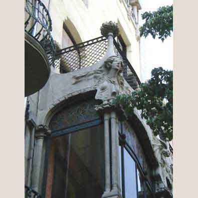 Encima de las columnas surgen cuatro ménsulas de piedra con relieves vegetales que aparentan soportar la tribuna y que continúan hacia arriba con los basamentos y columnillas que estructuran la tribuna, y los montantes del balcón situado encima, con una interesante barandilla de hierro. Esta tribuna de piedra, de formas ondulantes, presenta una rica decoración escultórica, así como interesantes vidrieras con decoración floral. Está decorada con relieves florales tanto en la parte inferior, como en los basamentos y capiteles de las columnillas –parecidas a las de la planta baja-. En la parte superior aparecen relieves de bustos femeninos y animales fantásticos.
