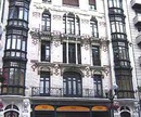 Ornamentación abundante en la fachada: temas simbolistas, ménsulas antropomórficas, cabezas femeninas entre hojas... Magnífica puerta de acceso al edificio, flanqueada a la altura del dintel por dos cabezas femeninas. El arquitecto Miguel García de la Cruz, responsable del proyecto, recurre a la combinación de piedra, azulejos y hierro en este, provisto de bajo para usos comerciales. Levantada en 1905. La composición se ajusta, aún, a los patrones clásicos del estilo regional, del que son buenos exponentes los acristalados miradores de madera. Una copiosa decoración se da cita en la fachada, sobresaliendo las cabezas femeninas que, entre ramas y hojas, culminan las terminaciones del cuarto piso; las representaciones simbólicas, o las ménsulas antropomórficas. Llama la atención, asimismo, la espléndida puerta de ingreso ¿custodiada a nivel del partido dintel por dos cabezas de féminas, con un complicado trabajo decorativo a base de escudos, troncos de vid, racimos, etc.