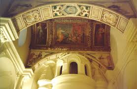 El interior exhibe un estilo no menos caprichoso: en las pilastras, que introducen una mezcla de dórico y jónico, y en la tribuna que acoge la escalera de caracol que sube al piso superior. Las bóvedas, pintadas probablemente por Rómulo Cincinato, que también trabajó en el palacio del Infantado, desarrollan un programa iconográfico de características erasmistas y simbólicas.